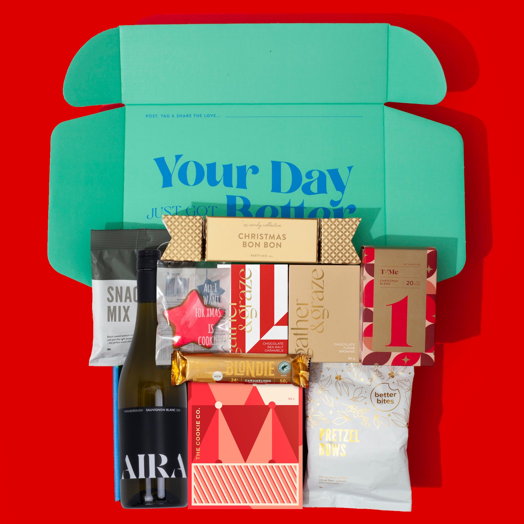 Festive, joyful, and filled with flavour, The All I Want For Christmas is the perfect gift to celebrate the season in style. This merry collection pairs a bottle of ARIA Sauvignon Blanc with a delightful mix of Christmas favourites and gourmet treats. From festive cookies and fudge brownies to indulgent caramels, tea, and chocolate, every item adds a touch of sparkle to the celebration. Beautifully presented and brimming with holiday cheer, it’s a thoughtful gift for clients, colleagues, friends, or family.