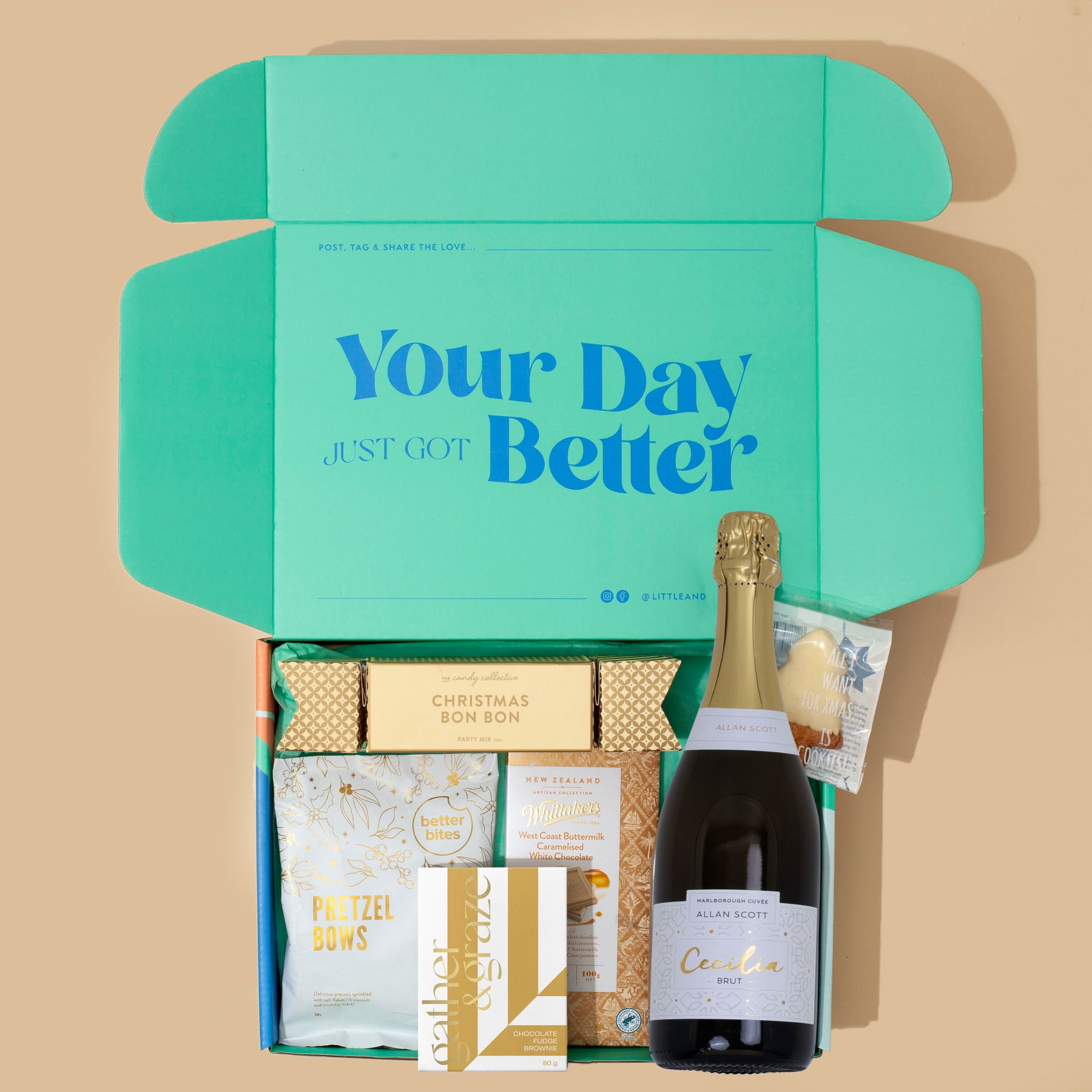 Celebrate the magic of the season with The Let It Snow, a sparkling Christmas gift box that blends elegance, indulgence, and a touch of holiday cheer. Featuring a bottle of Allan Scott Cecilia Brut, this festive collection pairs bubbles with a selection of sweet Christmas treats, from chocolate brownie and white chocolate to gingerbread and party mix. Perfect for clients, colleagues, or loved ones, it’s a thoughtful way to toast to the festive season in style.